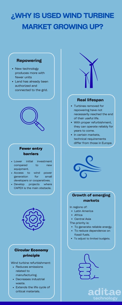 Wind turbines are complex industrial assets designed for long-term operation. In some cases, turbines removed during repowering or decommissioning processes still have components with remaining technical life, provided they meet applicable technical and regulatory requirements.